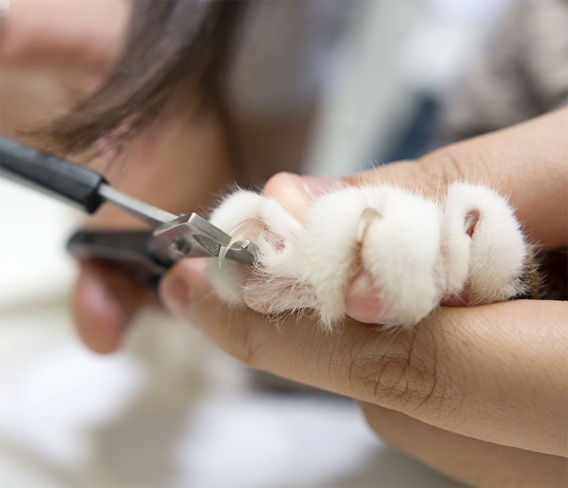 Before trimming nails, introduce your pet to the tool slowly and provide lots of treats at the same time. Start trimming slowly, only clipping away little portions of one or two nails at a time.